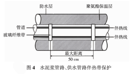 ⑤水泥漿管路、供水管路采用伴熱帶纏繞,外裹聚氨酯保溫(見圖4),嚴防跑冒滴漏,管路連接完畢,做緊閉性試驗檢查(其中一臺未采用聚氨酯發(fā)泡填實保溫,暴露在地表的切割箱,在零下10度左右進漿管凍裂);
