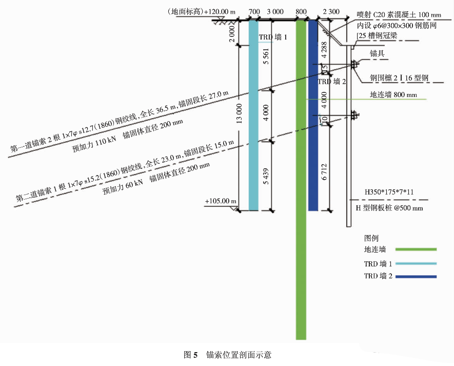 1、5號基坑支護方案:○800@1 050灌注樁+700 mm厚TRD止水墻,三道錨索.