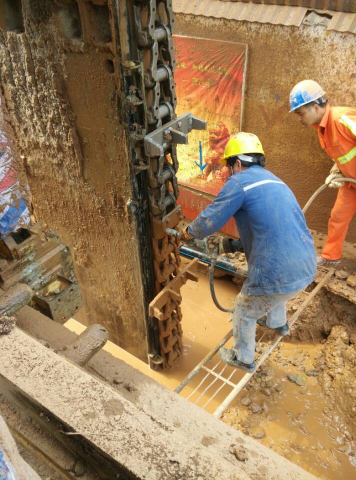 TRD工法是以鏈鋸式刀具為主要機具,在插入地基過程中鏈鋸式刀具與主機連接,回旋刀鏈鋸可豎向垂直或橫向水平移動進行對地下土體的切削,在刀具端頭噴出水泥漿硬化劑注入土體的同時注入高壓空氣使水泥漿與原位土體充分混合、攪拌將原位土體固結從而在地下形成一道等厚度的連續墻的一種施工工藝。