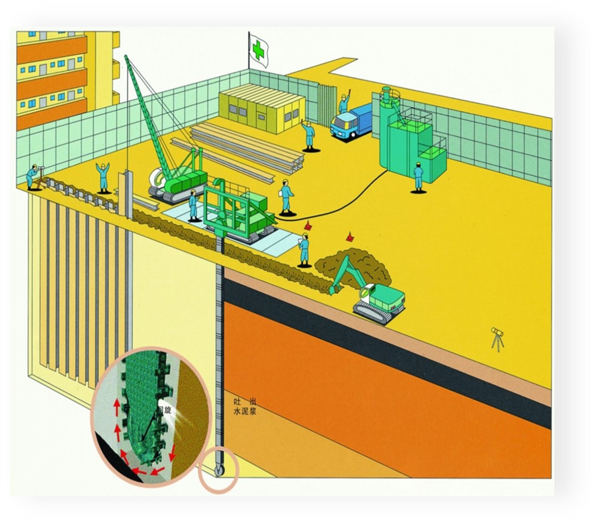 連續性刀鋸向垂直方向一次性的挖掘, 混合攪拌及橫向推進, 在復雜地層也可以保證均一質量的地下連續墻。
