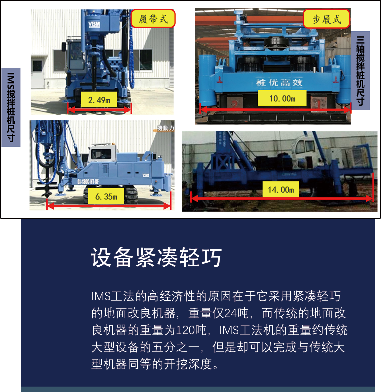 根據目前我國地下空間發展需要,結合國際先進理念,吉通地空科技引進了全國首臺IMS工法機。IMS工法又稱為微擾動攪拌樁工法,該工法機功率大,自重僅25噸,設備占用空間小,流動性好,且施工效率高,施工擾動小,響應微變形施工理念。該工法目前已經被應用于場地狹小工程及周邊環境敏感工程(如地鐵、危房、文保邊等)的地基處理、道橋加固、深基坑止水、地連墻槽壁加固等諸多領域,并取得了良好的施工效果。