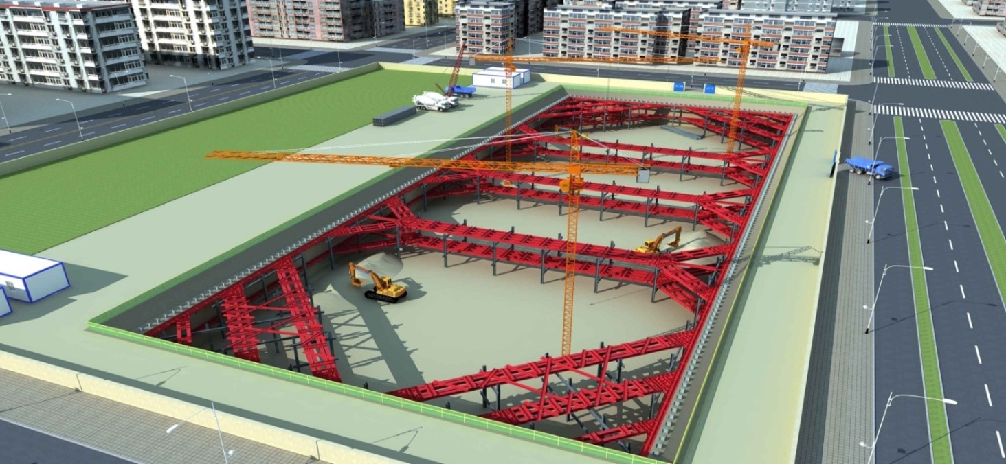 整個體系主要由對撐、角撐、圍檁、立柱、支撐梁和連接件組成,可根據基坑的不同形狀及要求設置月牙梁、斜拋撐和拱形撐,也可與混凝土支護結構結合使用,以滿足各類基坑支護要求。該技術可廣泛應用于地下室、地下車庫、地鐵、隧道、綜合管廊等工程。