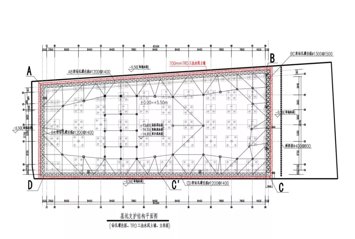 本工程圍護結(jié)構(gòu)采用700mm等厚度水泥土攪拌墻(TRD工法)作止水帷幕。因受地下46.5米以下強風(fēng)化巖層和中風(fēng)化巖層的影響,使得TRD工法機無法對其進(jìn)行切割挖掘,故先采用旋挖引孔的預(yù)處理方式再施工TRD工法樁。