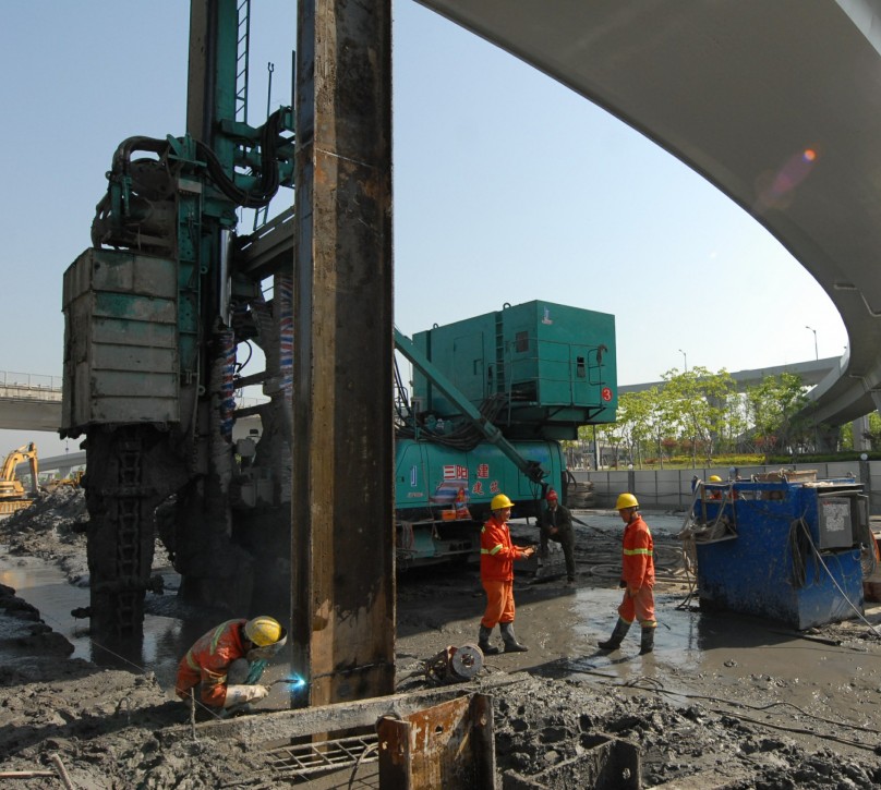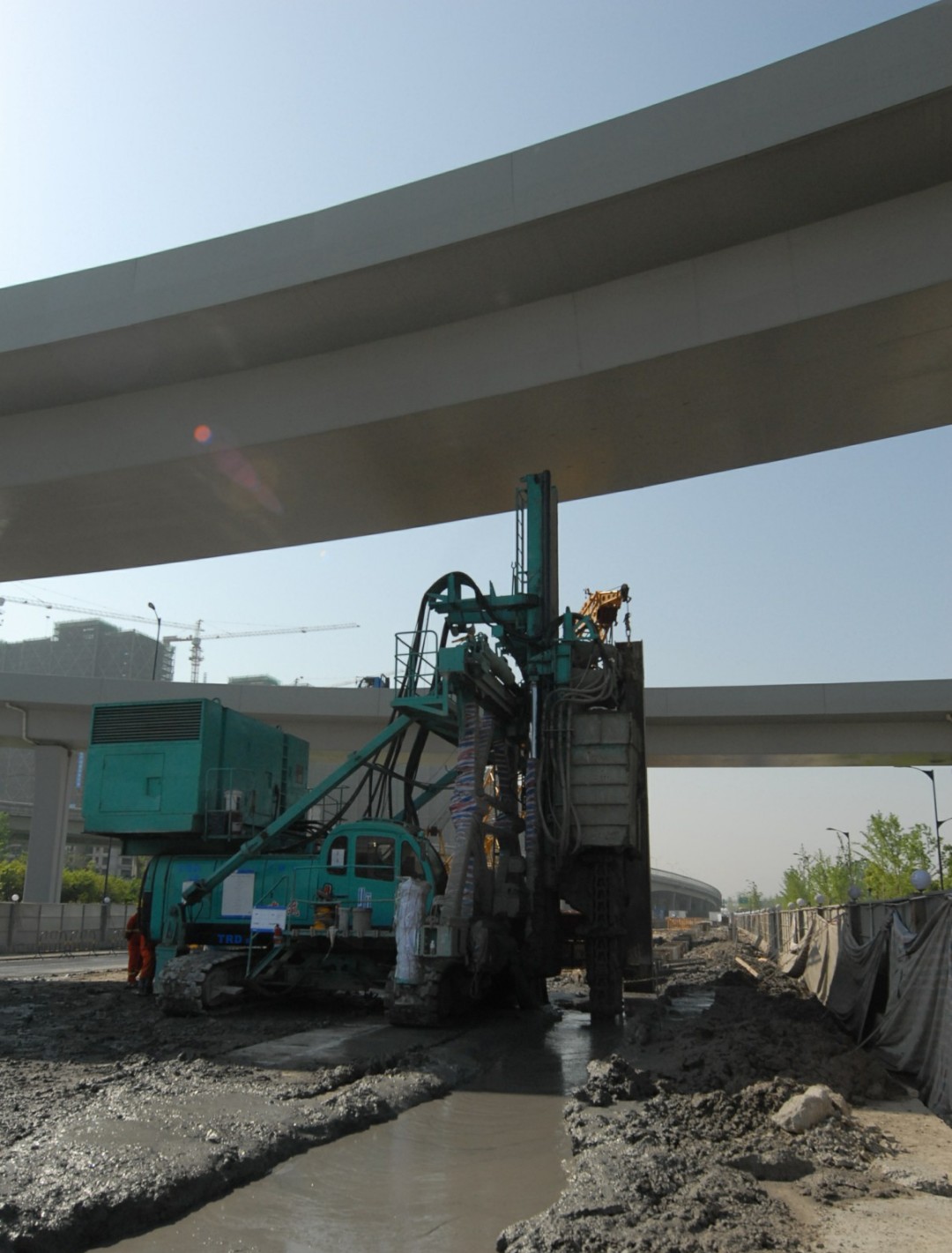該項目情況特殊,要在兩座高架橋凈高分別為10.6米、11.2米橋下施工,TRD工法機設備高度低,更穩定,止水帷幕操作空間剛滿足施工要求,但施工處(橋下)要插入24.5米的型鋼就非常困難,我們采取分段插入,立焊,保質保量的完成了施工任務。