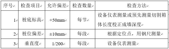1、水泥土攪拌墻墻厚850mm,墻體垂直度允許偏差為1/300,墻位偏差不大于+20mm~-50mm(向坑內偏差為正),墻深偏差不得大于50mm,成墻厚度應不小于設計墻厚,偏差控制在0~-20mm(控制切割箱刀頭尺寸偏差)。