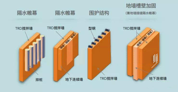 TRD工法(Trench-Cutting & Re-mixing Deep Wall Method),又稱等厚度水泥土地下連續墻工法,其基本原理是利用鏈鋸式刀具箱豎直插入地層中,然后作水平橫向運動,同時由鏈條帶動刀具作上下的回轉運動,攪拌混合原土并灌入水泥漿,形成一定強度和厚度的墻。