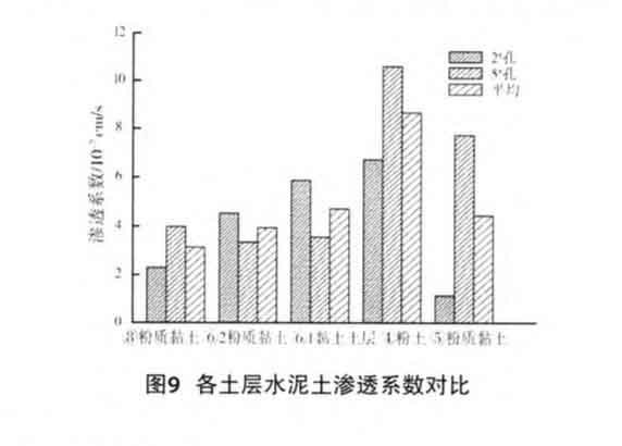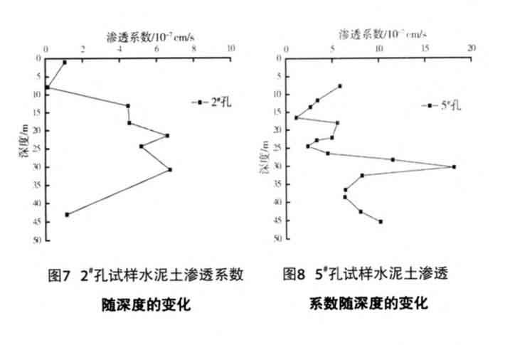 從滲透系數范圍可以推測:在黏土、粉土、以及粉質黏土層范圍內,經TRD工法作用,使該范圍土層得到充分攪拌,上下基本均勻一致,未出現黏土成塊和局部漿液富集的現象,水泥攪拌土結構致密。經試驗分析,水泥攪拌土滲透系數均在10^(-7)數量級,同土層施工效果的平均性較好。