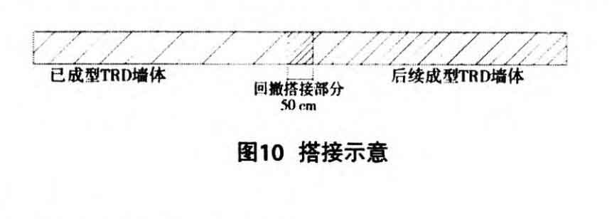 (g)成墻搭接,新老墻體區域搭接質量要嚴格控制,尤其是挖掘和攪拌速度,使土體中混合泥漿與固化液充分攪拌和混合。搭接寬度宜控制在50cm左右(圖10)。