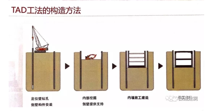 TAD工法(Trench cutting Assembled Diaphragm wall) 即渠式切割裝配式地下連續墻工法,該工法涉及在渠式切割水泥土連續墻(或雙輪鉸成墻)從水泥土墻中間插入預應力榫卯結構(鎖扣)鋼筋混凝土預制墻板形成裝配式地下連續墻的一種施工工藝。
