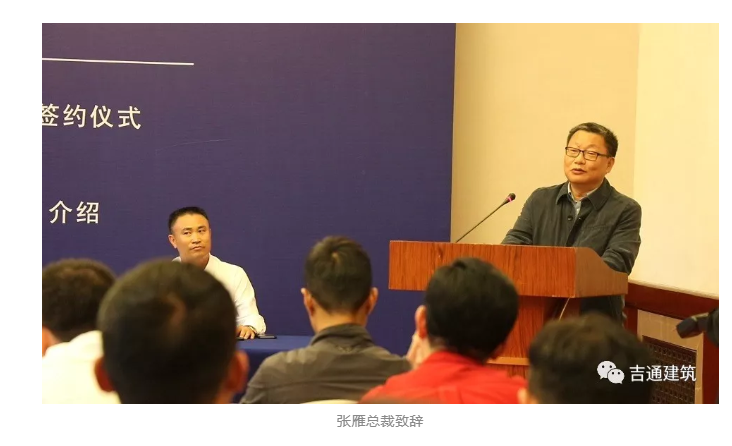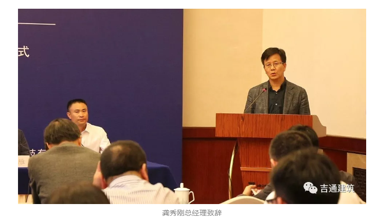下午14時、簽約儀式和研討會正式開始、本次簽約儀式有幸邀請到了浙江省建筑業管理局吳偉民副局長、杭州錢塘智慧城管委會倪學英副主任蒞臨!浙江吉通地空建筑科技有限公司董事長江正兵為此次簽約儀式致精彩歡迎辭,中國工程院院士龔曉南、建華建材(中國)有限公司總裁張雁、上海工程機械廠有限公司總經理龔秀剛相繼致辭發言。